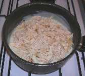- Desmenuzar las pechugas de pollo e incorporar a la preparación anterior.