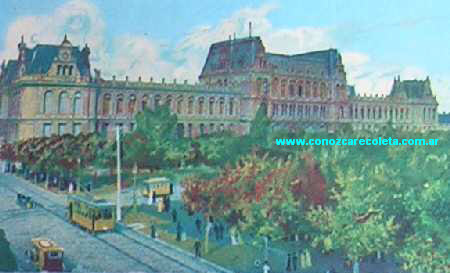 La diferencia entre ayer y hoy se aprecia en el color de su fachada (ahora es blanca), las bohardillas que antes no tenía, el tranvía que ya no funciona y la existencia de un moderno edificio que aparece en la foto actual.