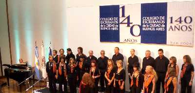 La ceremonia contó con el aporte musical a cargo del Coro del Colegio de Escribanos (foto), que interpretó el Himno Nacional Argentino, acompañado al piano por el Escribano Horacio Gigli, y luego compartieron el escenario con el Coro del Country Club Los Lagartos, a cargo de Silvia Pérez y Luis María Serra respectivamente, los que interpretaron un repertorio que incluyó temas como Over the rainbow de Harold Arlen y Va Pensiero de Giusseppe Verdi.