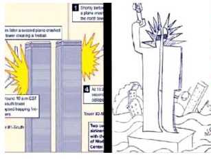 Podemos observar el dibujo de Parravicini, a la derecha y compararlo con el de la izquierda, realizado por la CNN para ilustrar el atentado a las torres gemelas.