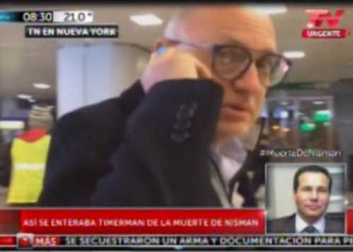 La noticia salió en los medios coincidiendo con la llegada del canciller Héctor Timerman a Nueva York, que a pesar de ser uno de los acusados, viajó para asistir a una reunión del Consejo de Seguridad de las Naciones Unidas. En el aeropuerto lo esperaba una cronista de TN, Silvina Sterin Pensel, que se acercó al funcionario para entrevistarlo, pero éste tomó su teléfono celular y fingió que estaba hablando con alguien, aunque todo el mundo se dio cuenta que no abrió la boca en ningún momento. Luego, fastidiado por la presencia de la periodista, se dirigió a un automóvil que lo esperaba y lo único que dijo fue: “No sé nada, acabo de aterrizar”, ante la insistencia de la cronista expresó “Lamento la muerte de un ser humano” y finalmente dijo que se había enterado mediante “un mensaje de texto”.
