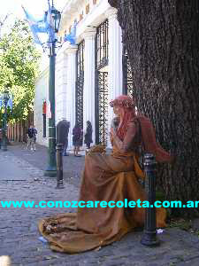 Puerta de ingreso al Cementerio de Recoleta, donde se aprecia una estatua viviente. Es uno de los atractivos que pueden verse en las calles de este barrio.